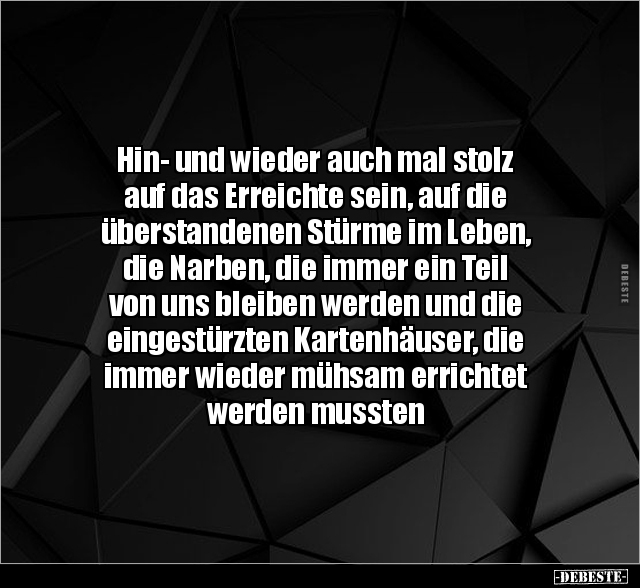 Hin- und wieder auch mal stolz auf das Erreichte sein, auf die überstandenen Stürme im Leben, die Narben, die immer ein Teil von uns bleiben werden und die eingestürzten Kartenhäuser, die immer wieder mühsam errichtet werden mussten
