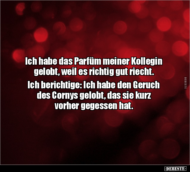 Ich habe das Parfüm meiner Kollegin gelobt, weil es richtig gut riecht. Ich berichtige: Ich habe den Geruch des Cornys gelobt, das sie kurz vorher gegessen hat.