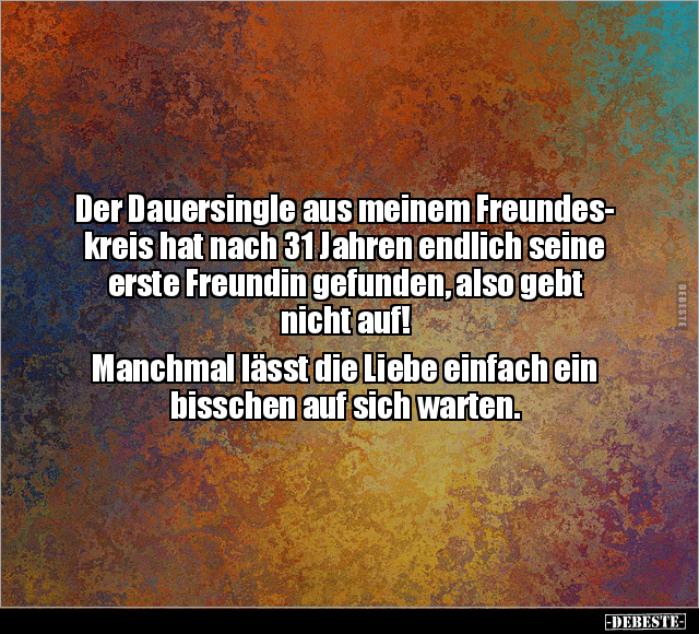 Der Dauersingle aus meinem Freundes- kreis hat nach 31 Jahren endlich seine erste Freundin gefunden, also gebt nicht auf! Manchmal lässt die Liebe einfach ein bisschen auf sich warten.