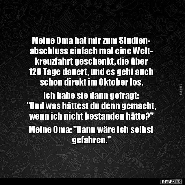 Meine Oma hat mir zum Studien- abschluss einfach mal eine Welt- kreuzfahrt geschenkt, die über 128 Tage dauert, und es geht auch schon direkt im Oktober los. Ich habe sie dann gefragt: "Und was hättest du denn gemacht, wenn ich nicht bestanden hätte?" Meine Oma: "Dann wäre ich selbst gefahren."