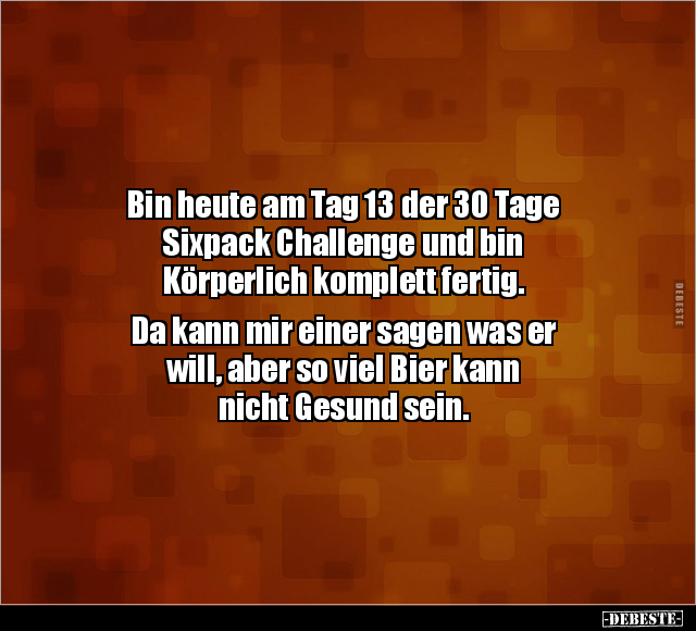 Bin heute am Tag 13 der 30 Tage Sixpack Challenge und bin Körperlich komplett fertig. Da kann mir einer sagen was er will, aber so viel Bier kann nicht Gesund sein.