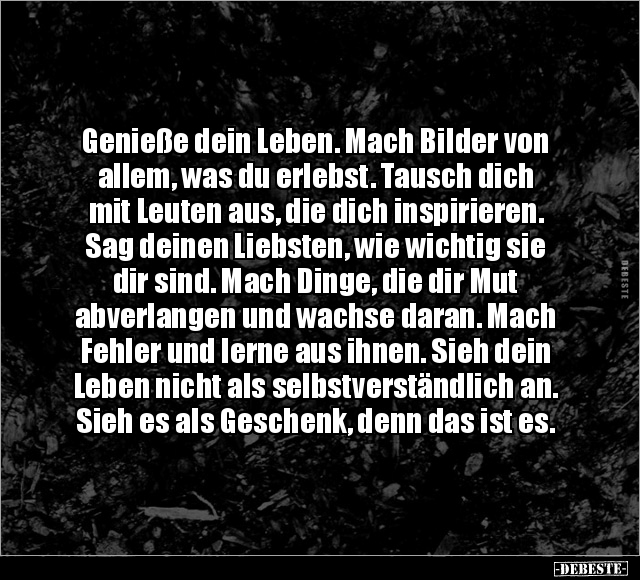 Genieße dein Leben. Mach Bilder von allem, was du erlebst. Tausch dich mit Leuten aus, die dich inspirieren. Sag deinen Liebsten, wie wichtig sie dir sind. Mach Dinge, die dir Mut abverlangen und wachse daran. Mach Fehler und lerne aus ihnen. Sieh dein Leben nicht als selbstverständlich an. Sieh es als Geschenk, denn das ist es.