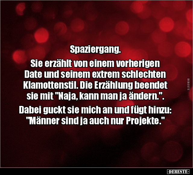 Spaziergang. Sie erzählt von einem vorherigen Date und seinem extrem schlechten Klamottenstil. Die Erzählung beendet sie mit "Naja, kann man ja ändern.". Dabei guckt sie mich an und fügt hinzu: "Männer sind ja auch nur Projekte."