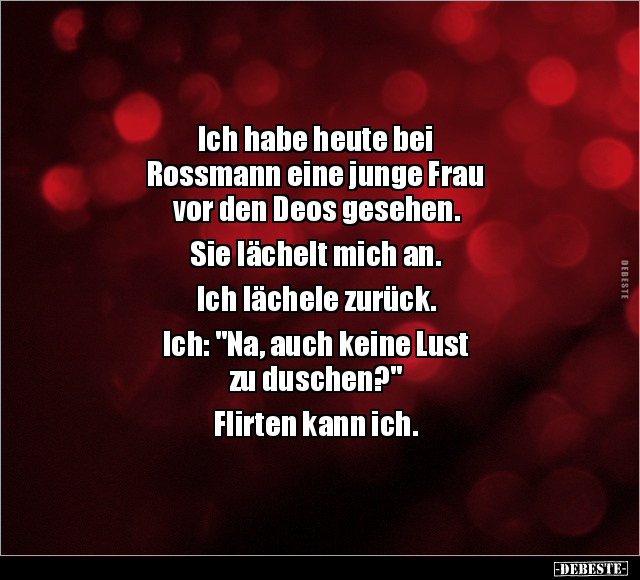 Ich habe heute bei Rossmann eine junge Frau vor den Deos gesehen. Sie lächelt mich an. Ich lächele zurück. Ich: "Na, auch keine Lust zu duschen?" Flirten kann ich.