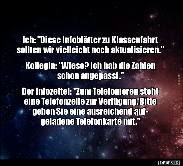 Ich: "Diese Infoblätter zu Klassenfahrt sollten wir vielleicht noch aktualisieren." Kollegin: "Wieso? Ich hab die Zahlen schon angepasst." Der Infozettel: "Zum Telefonieren steht eine Telefonzelle zur Verfügung. Bitte geben Sie eine ausreichend auf- geladene Telefonkarte mit."