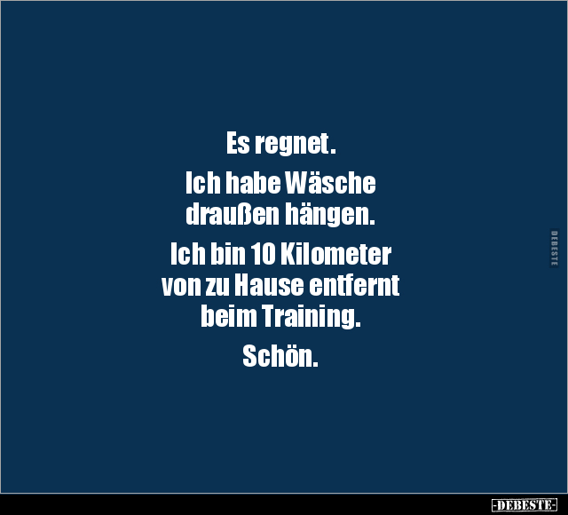 Es regnet. Ich habe Wäsche draußen hängen. Ich bin 10 Kilometer von zu Hause entfernt beim Training. Schön.