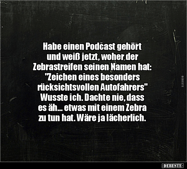 Habe einen Podcast gehört und weiß jetzt, woher der Zebrastreifen seinen Namen hat: "Zeichen eines besonders rücksichtsvollen Autofahrers" Wusste ich. Dachte nie, dass es äh... etwas mit einem Zebra zu tun hat. Wäre ja lächerlich.