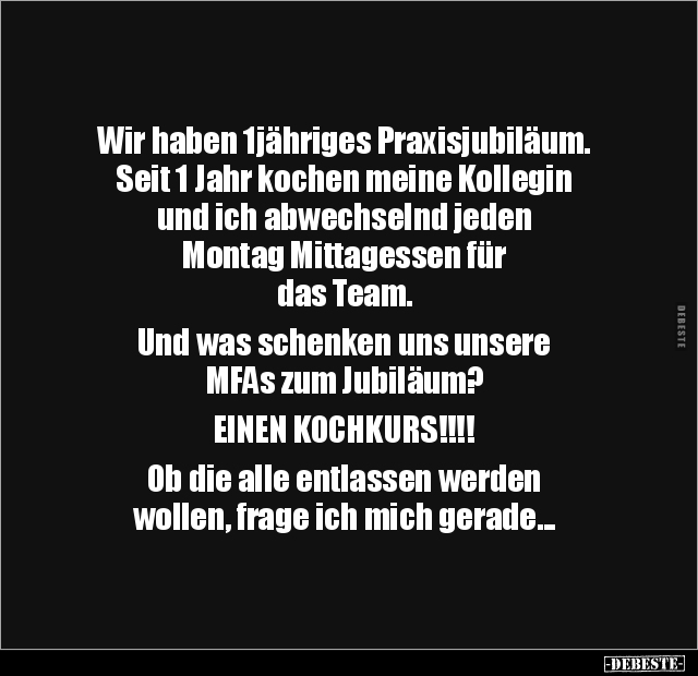 Wir haben 1jähriges Praxisjubiläum. Seit 1 Jahr kochen meine Kollegin und ich abwechselnd jeden Montag Mittagessen für das Team. Und was schenken uns unsere MFAs zum Jubiläum? EINEN KOCHKURS!!!! Ob die alle entlassen werden wollen, frage ich mich gerade...