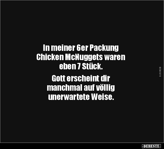 In meiner 6er Packung Chicken McNuggets waren eben 7 Stück. Gott erscheint dir manchmal auf völlig unerwartete Weise.