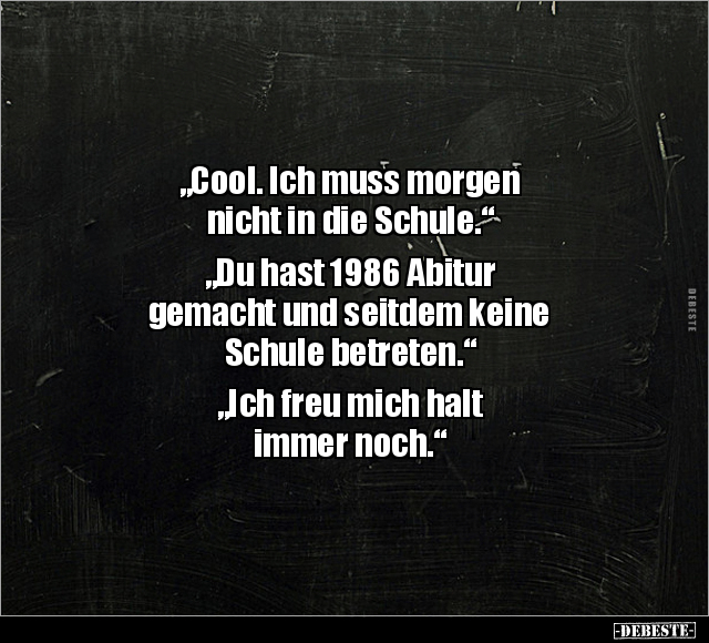 „Cool. Ich muss morgen nicht in die Schule.“ „Du hast 1986 Abitur gemacht und seitdem keine Schule betreten.“ „Ich freu mich halt immer noch.“