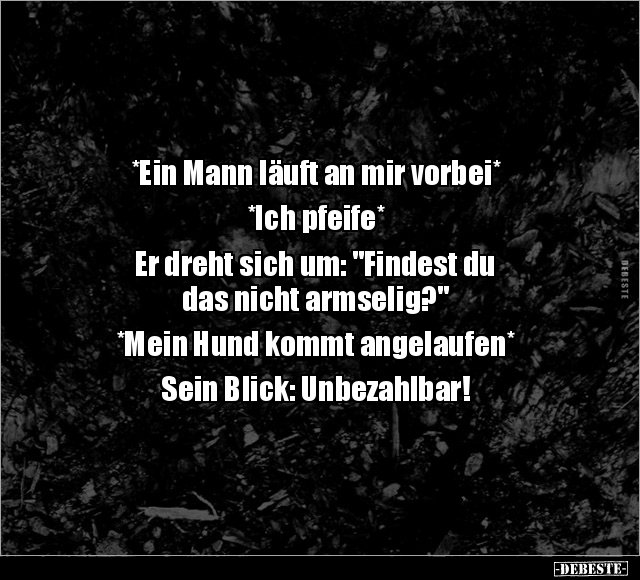 *Ein Mann läuft an mir vorbei* *Ich pfeife* Er dreht sich um: "Findest du das nicht armselig?" *Mein Hund kommt angelaufen* Sein Blick: Unbezahlbar!