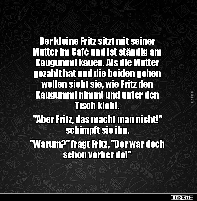 Der kleine Fritz sitzt mit seiner Mutter im Café und ist ständig am Kaugummi kauen. Als die Mutter gezahlt hat und die beiden gehen wollen sieht sie, wie Fritz den Kaugummi nimmt und unter den Tisch klebt. "Aber Fritz, das macht man nicht!" schimpft sie ihn. "Warum?" fragt Fritz, "Der war doch schon vorher da!"