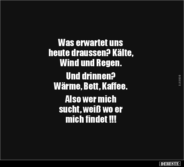 Was erwartet uns heute draussen? Kälte, Wind und Regen. Und drinnen? Wärme, Bett, Kaffee. Also wer mich sucht, weiß wo er mich findet !!!