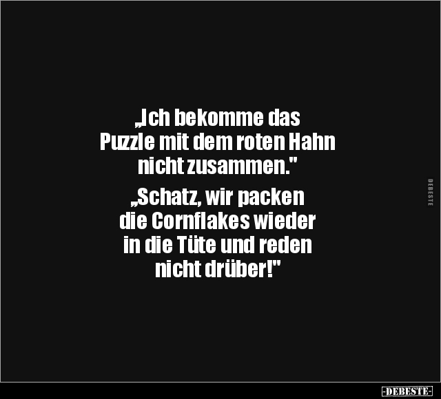 ,,Ich bekomme das Puzzle mit dem roten Hahn nicht zusammen." ,,Schatz, wir packen die Cornflakes wieder in die Tüte und reden nicht drüber!"