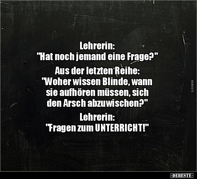 Lehrerin: "Hat noch jemand eine Frage?" Aus der letzten Reihe: "Woher wissen Blinde, wann sie aufhören müssen, sich den Arsch abzuwischen?" Lehrerin: "Fragen zum UNTERRICHT!"