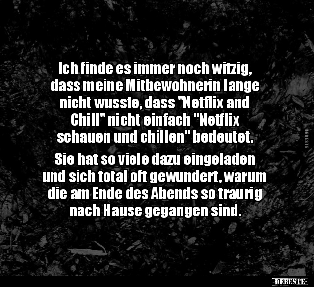 Ich finde es immer noch witzig, dass meine Mitbewohnerin lange nicht wusste, dass "Netflix and Chill" nicht einfach "Netflix schauen und chillen" bedeutet. Sie hat so viele dazu eingeladen und sich total oft gewundert, warum die am Ende des Abends so traurig nach Hause gegangen sind.