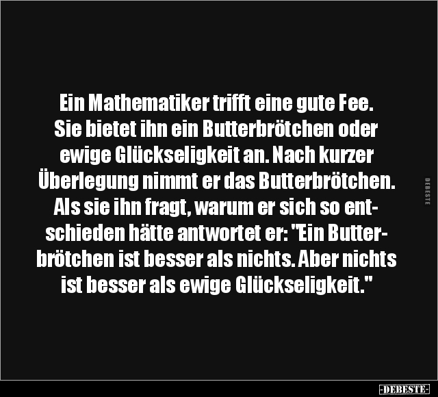 Ein Mathematiker trifft eine gute Fee. Sie bietet ihn ein Butterbrötchen oder ewige Glückseligkeit an. Nach kurzer Überlegung nimmt er das Butterbrötchen. Als sie ihn fragt, warum er sich so ent- schieden hätte antwortet er: "Ein Butter- brötchen ist besser als nichts. Aber nichts ist besser als ewige Glückseligkeit."