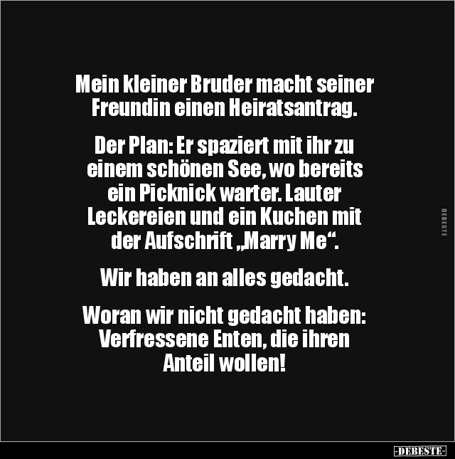 Mein kleiner Bruder macht seiner Freundin einen Heiratsantrag. Der Plan: Er spaziert mit ihr zu einem schönen See, wo bereits ein Picknick warter. Lauter Leckereien und ein Kuchen mit der Aufschrift „Marry Me“. Wir haben an alles gedacht. Woran wir nicht gedacht haben: Verfressene Enten, die ihren Anteil wollen!