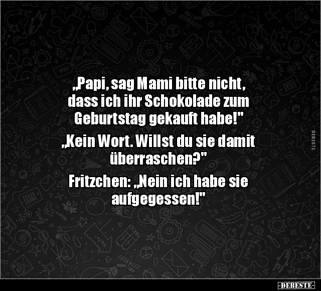 „Papi, sag Mami bitte nicht, dass ich ihr Schokolade zum Geburtstag gekauft habe!" „Kein Wort. Willst du sie damit überraschen?" Fritzchen: „Nein ich habe sie aufgegessen!"