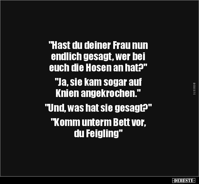"Hast du deiner Frau nun endlich gesagt, wer bei euch die Hosen an hat?" "Ja, sie kam sogar auf Knien angekrochen." "Und, was hat sie gesagt?" "Komm unterm Bett vor, du Feigling"