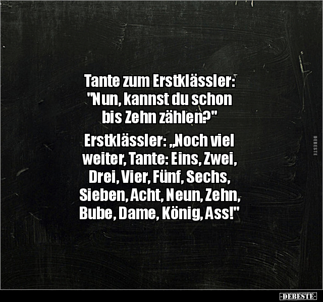 Tante zum Erstklässler: "Nun, kannst du schon bis Zehn zählen?" Erstklässler: „Noch viel weiter, Tante: Eins, Zwei, Drei, Vier, Fünf, Sechs, Sieben, Acht, Neun, Zehn, Bube, Dame, König, Ass!"