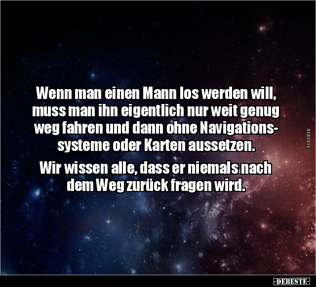 Wenn man einen Mann los werden will, muss man ihn eigentlich nur weit genug weg fahren und dann ohne Navigations- systeme oder Karten aussetzen. Wir wissen alle, dass er niemals nach dem Weg zurück fragen wird.