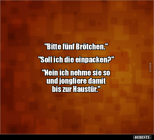 "Bitte fünf Brötchen." "Soll ich die einpacken?" "Nein ich nehme sie so und jongliere damit bis zur Haustür."