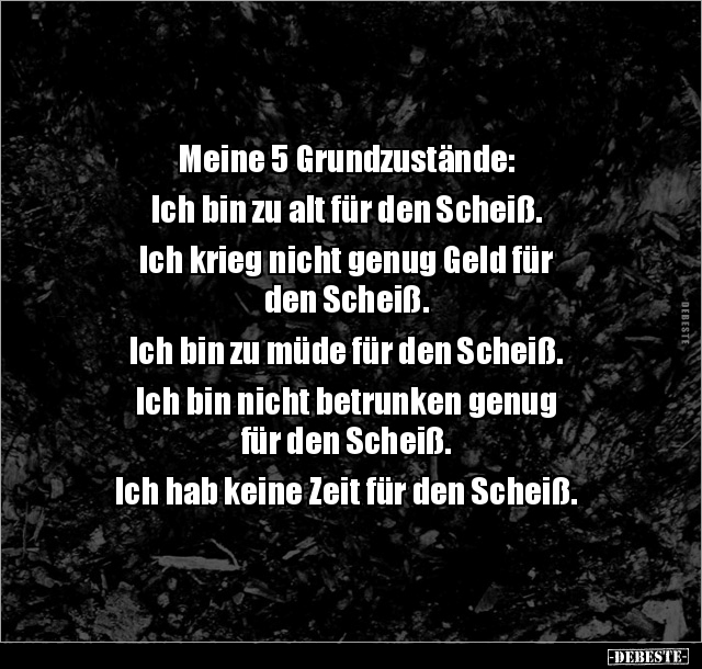 Meine 5 Grundzustände: Ich bin zu alt für den Scheiß. Ich krieg nicht genug Geld für den Scheiß. Ich bin zu müde für den Scheiß. Ich bin nicht betrunken genug für den Scheiß. Ich hab keine Zeit für den Scheiß.