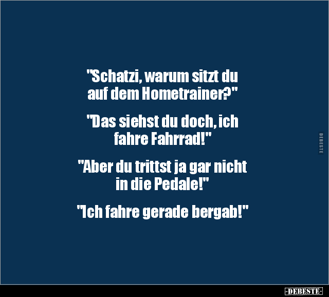 "Schatzi, warum sitzt du auf dem Hometrainer?" "Das siehst du doch, ich fahre Fahrrad!" "Aber du trittst ja gar nicht in die Pedale!" "Ich fahre gerade bergab!"
