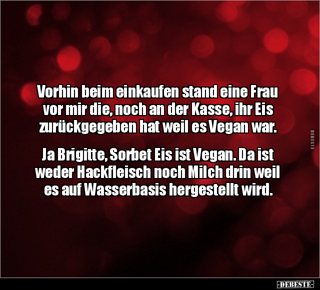 Vorhin beim einkaufen stand eine Frau vor mir die, noch an der Kasse, ihr Eis zurückgegeben hat weil es Vegan war. Ja Brigitte, Sorbet Eis ist Vegan. Da ist weder Hackfleisch noch Milch drin weil es auf Wasserbasis hergestellt wird.