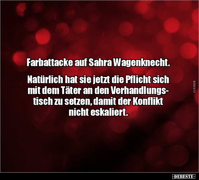 Farbattacke auf Sahra Wagenknecht. Natürlich hat sie jetzt die Pflicht sich mit dem Täter an den Verhandlungs- tisch zu setzen, damit der Konflikt nicht eskaliert.