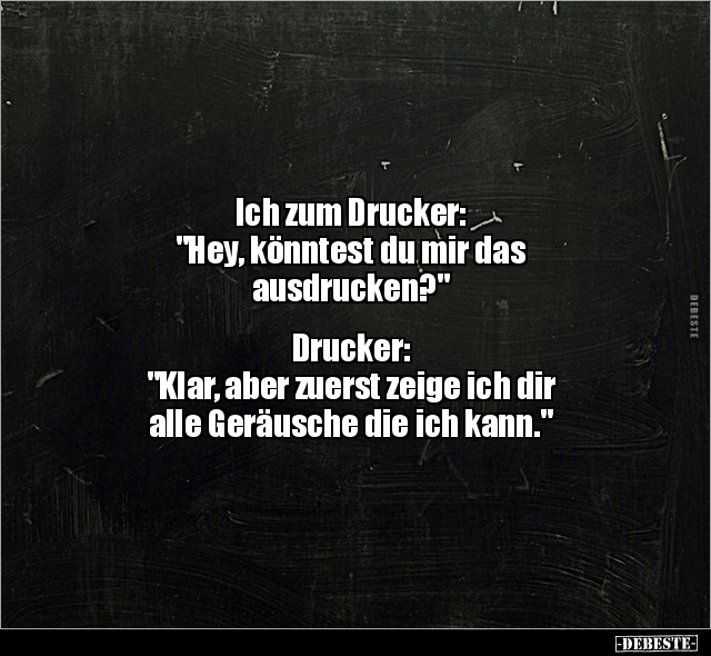 Ich zum Drucker: "Hey, könntest du mir das ausdrucken?" Drucker: "Klar, aber zuerst zeige ich dir alle Geräusche die ich kann."