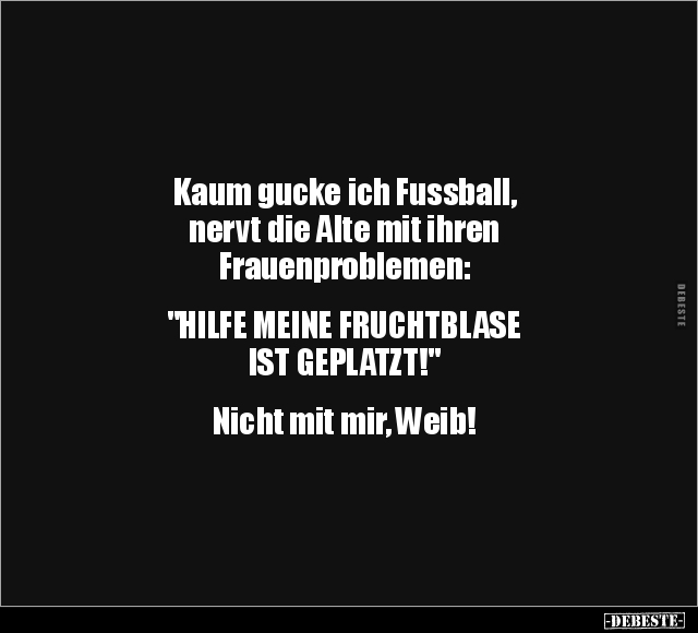 Kaum gucke ich Fussball, nervt die Alte mit ihren Frauenproblemen: "HILFE MEINE FRUCHTBLASE IST GEPLATZT!" Nicht mit mir, Weib!