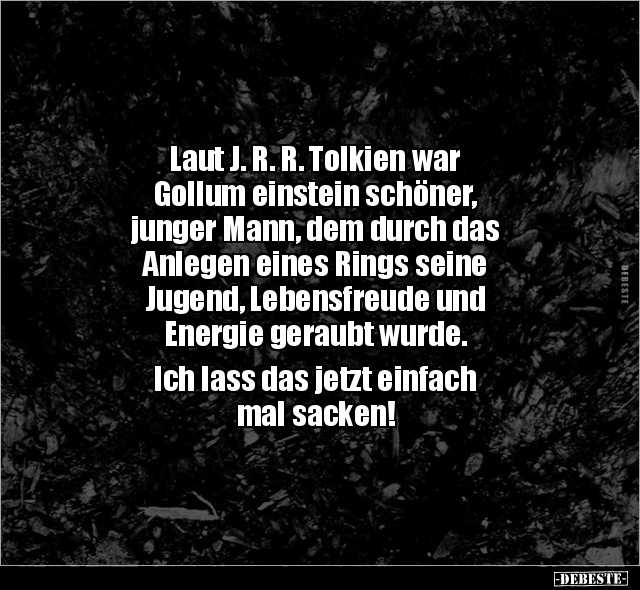 Laut J. R. R. Tolkien war Gollum einstein schöner, junger Mann, dem durch das Anlegen eines Rings seine Jugend, Lebensfreude und Energie geraubt wurde. Ich lass das jetzt einfach mal sacken!