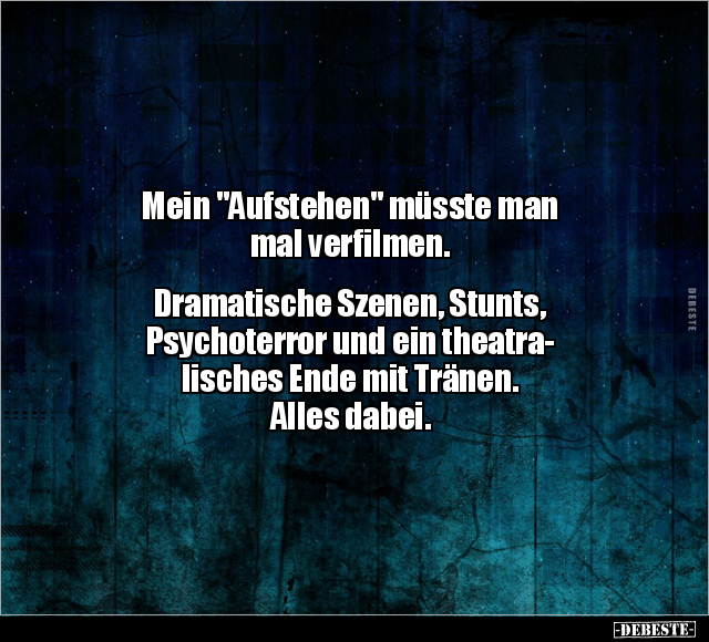 Mein "Aufstehen" müsste man mal verfilmen. Dramatische Szenen, Stunts, Psychoterror und ein theatra- lisches Ende mit Tränen. Alles dabei.
