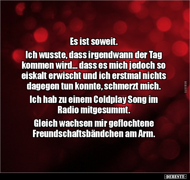 Es ist soweit. Ich wusste, dass irgendwann der Tag kommen wird... dass es mich jedoch so eiskalt erwischt und ich erstmal nichts dagegen tun konnte, schmerzt mich. Ich hab zu einem Coldplay Song im Radio mitgesummt. Gleich wachsen mir geflochtene Freundschaftsbändchen am Arm.