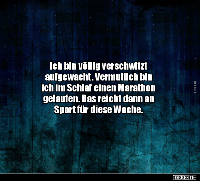 Ich bin völlig verschwitzt aufgewacht. Vermutlich bin ich im Schlaf einen Marathon gelaufen. Das reicht dann an Sport für diese Woche.
