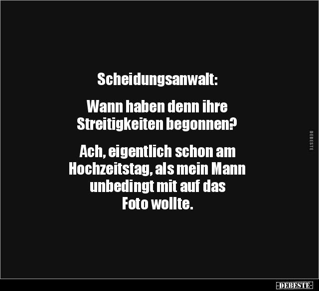 Scheidungsanwalt: Wann haben denn ihre Streitigkeiten begonnen? Ach, eigentlich schon am Hochzeitstag, als mein Mann unbedingt mit auf das Foto wollte.