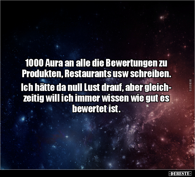 1000 Aura an alle die Bewertungen zu Produkten, Restaurants usw schreiben. Ich hätte da null Lust drauf, aber gleich- zeitig will ich immer wissen wie gut es bewertet ist.