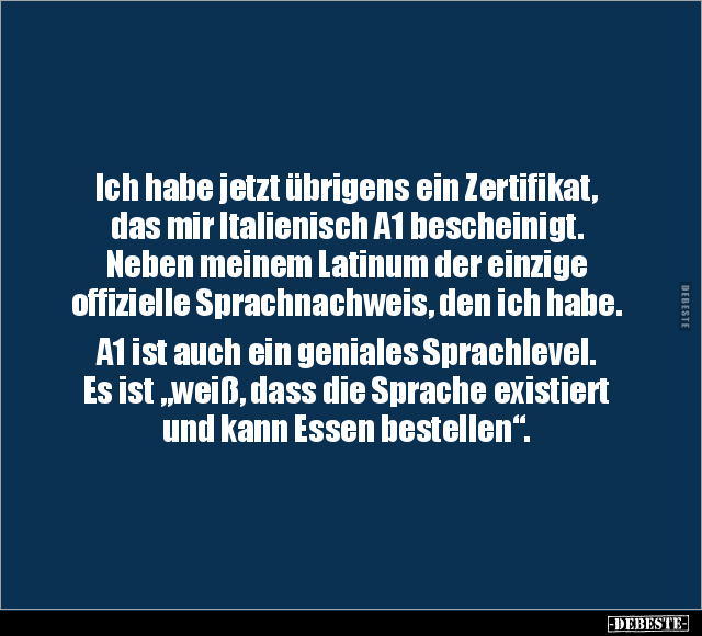 Ich habe jetzt übrigens ein Zertifikat, das mir Italienisch A1 bescheinigt. Neben meinem Latinum der einzige offizielle Sprachnachweis, den ich habe. A1 ist auch ein geniales Sprachlevel. Es ist „weiß, dass die Sprache existiert und kann Essen bestellen“.
