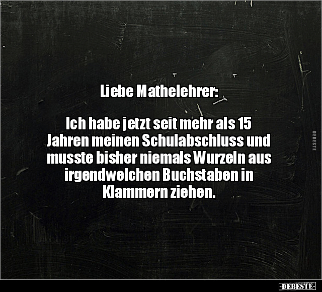 Liebe Mathelehrer: Ich habe jetzt seit mehr als 15 Jahren meinen Schulabschluss und musste bisher niemals Wurzeln aus irgendwelchen Buchstaben in Klammern ziehen.