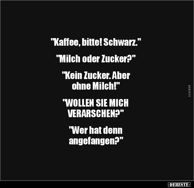 "Kaffee, bitte! Schwarz." "Milch oder Zucker?" "Kein Zucker. Aber ohne Milch!" "WOLLEN SIE MICH VERARSCHEN?" "Wer hat denn angefangen?"