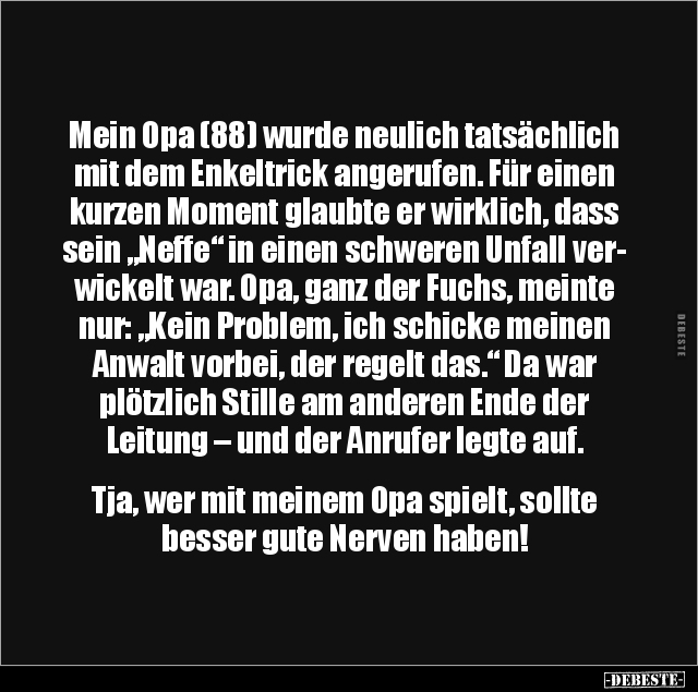Mein Opa (88) wurde neulich tatsächlich mit dem Enkeltrick angerufen. Für einen kurzen Moment glaubte er wirklich, dass sein „Neffe“ in einen schweren Unfall ver- wickelt war. Opa, ganz der Fuchs, meinte nur: „Kein Problem, ich schicke meinen Anwalt vorbei, der regelt das.“ Da war plötzlich Stille am anderen Ende der Leitung – und der Anrufer legte auf. Tja, wer mit meinem Opa spielt, sollte besser gute Nerven haben!