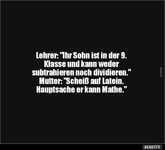 Lehrer: "Ihr Sohn ist in der 9. Klasse und kann weder subtrahieren noch dividieren." Mutter: "Scheiß auf Latein. Hauptsache er kann Mathe."