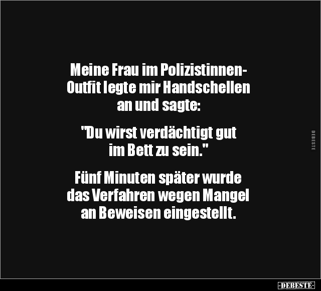 Meine Frau im Polizistinnen- Outfit legte mir Handschellen an und sagte: "Du wirst verdächtigt gut im Bett zu sein." Fünf Minuten später wurde das Verfahren wegen Mangel an Beweisen eingestellt.
