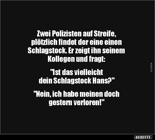 Zwei Polizisten auf Streife, plötzlich findet der eine einen Schlagstock. Er zeigt ihn seinem Kollegen und fragt: "Ist das vielleicht dein Schlagstock Hans?" "Nein, ich habe meinen doch gestern verloren!"