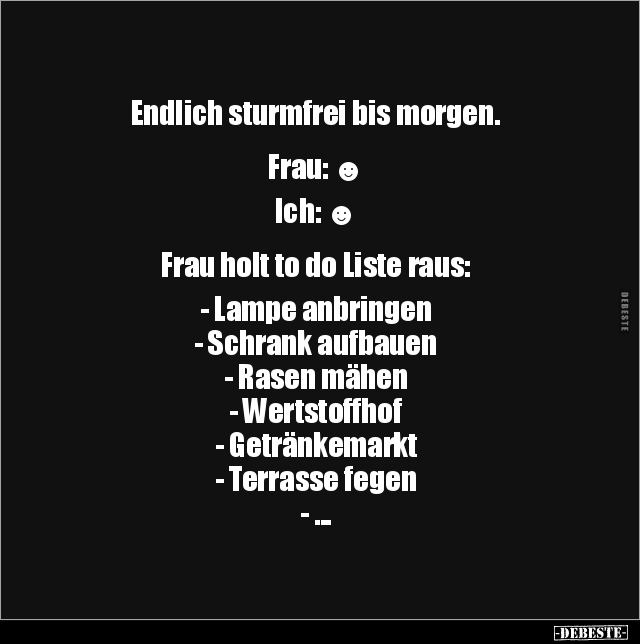 Endlich sturmfrei bis morgen. Frau: ☻ Ich: ☻ Frau holt to do Liste raus: - Lampe anbringen - Schrank aufbauen - Rasen mähen - Wertstoffhof - Getränkemarkt - Terrasse fegen - ...