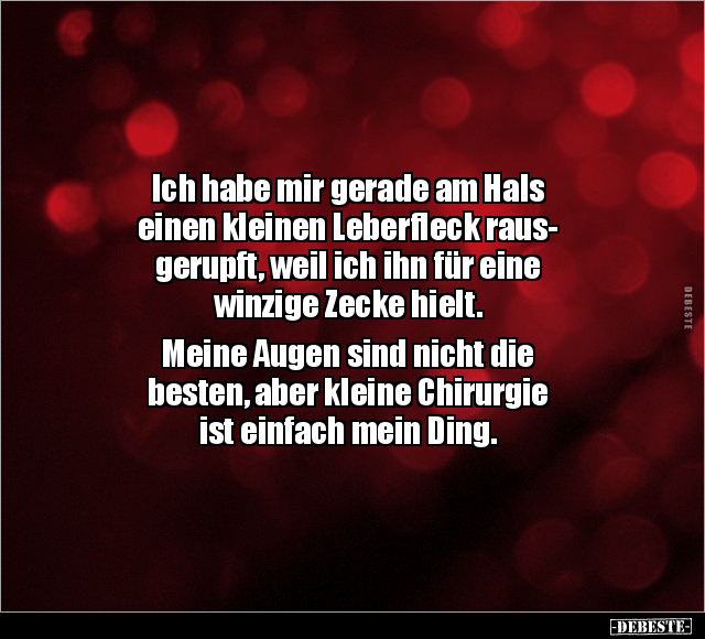 Ich habe mir gerade am Hals einen kleinen Leberfleck raus- gerupft, weil ich ihn für eine winzige Zecke hielt. Meine Augen sind nicht die besten, aber kleine Chirurgie ist einfach mein Ding.