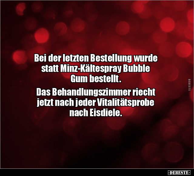 Bei der letzten Bestellung wurde statt Minz-Kältespray Bubble Gum bestellt. Das Behandlungszimmer riecht jetzt nach jeder Vitalitätsprobe nach Eisdiele.
