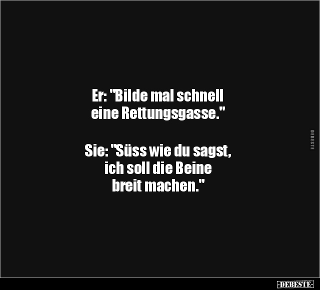 Er: "Bilde mal schnell eine Rettungsgasse." Sie: "Süss wie du sagst, ich soll die Beine breit machen."